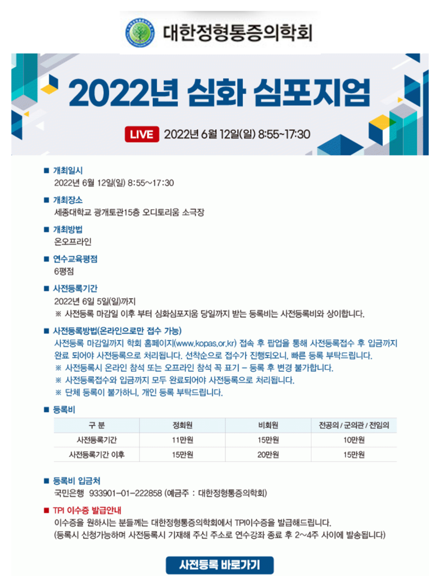 [대한정형통증의학회] 2022년 심화심포지엄 (*TPI자격증 발급*)(온오프라인개최)(2022.06.12) 프로그램 및 사전등록 안내드립니다.