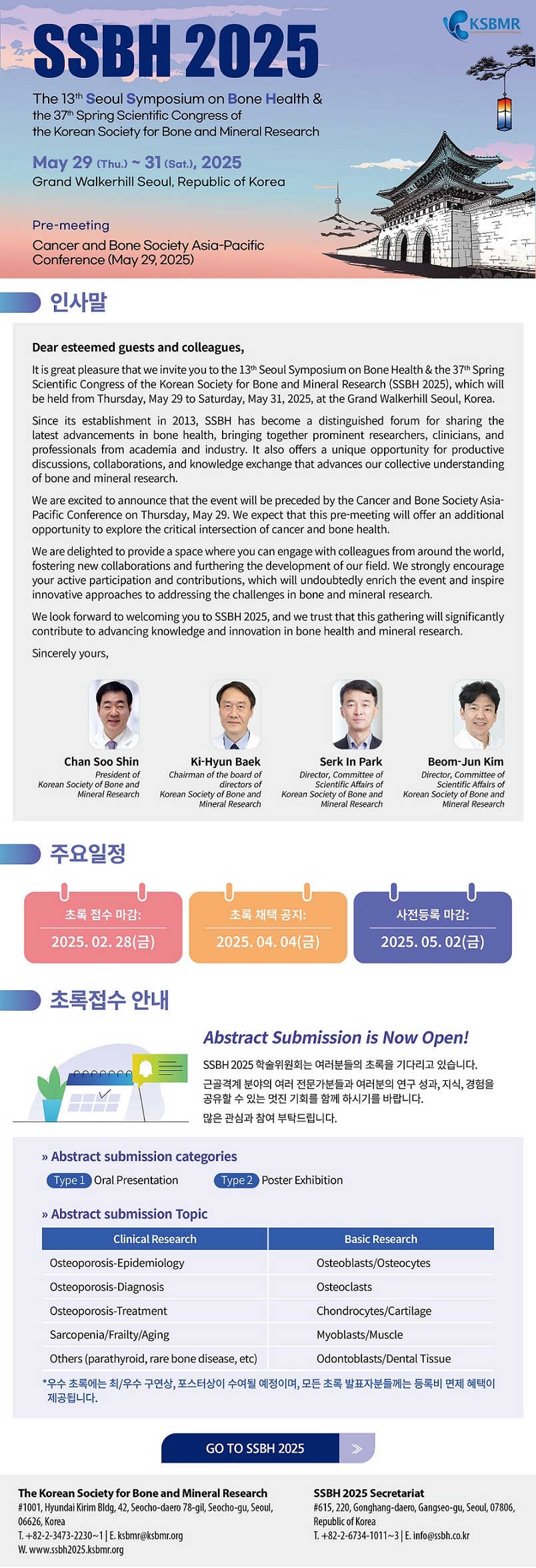 2025년 대한골대사학회 The 13th Seoul Symposium on Bone Health (SSBH 2025) & 제37차 춘계학술대회