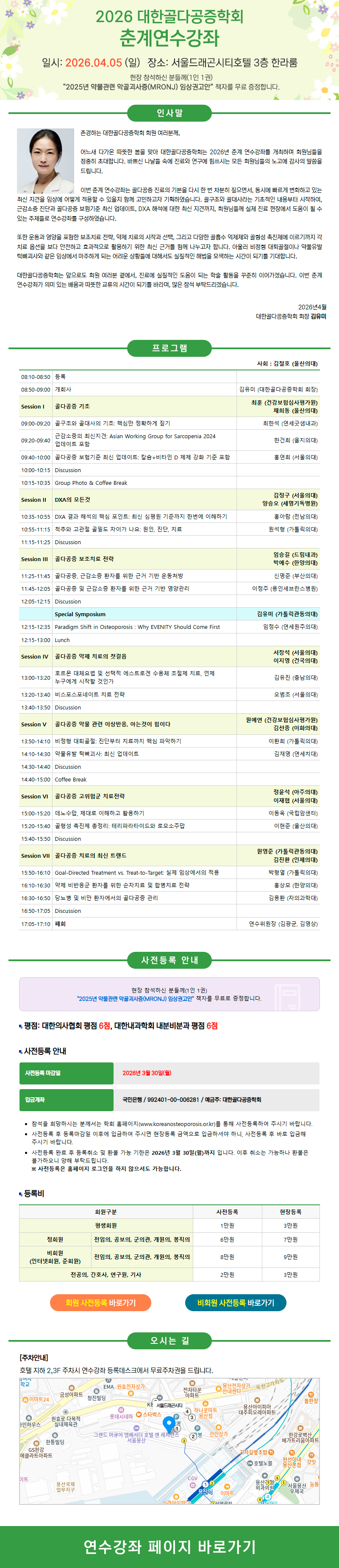 2026년 4월 5일 대한골다공증학회 춘계연수강좌 개최 안내(마감:3월 30일)